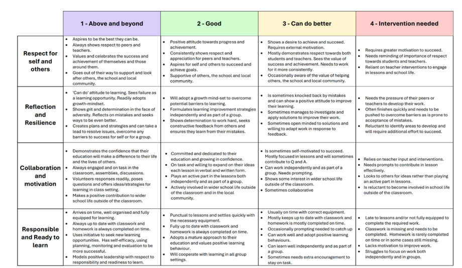 For students that are identified as Amber or Red several interventions will be offered, these include but not limited to: teacher led interventions (P6 lessons), teaching/house assistant interventions and student mentoring. The student report will also provide an attitude to learning. The table below outlines the criteria associated with each attitude for the four learning characteristics (clicking on the table will open a larger image).